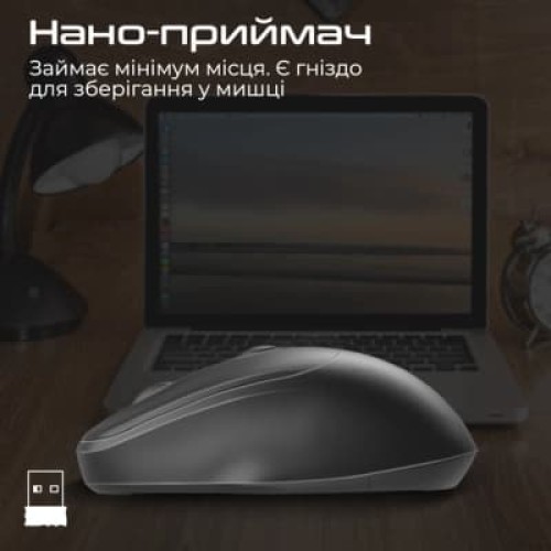 Класичні, для ноутбука, бездротове, USB адаптер 2.4 ГГц, оптичний, 1600 dpi, кількість кнопок - 4, 1 х AA, середня, 108 х 68 х 39 мм, 110 г