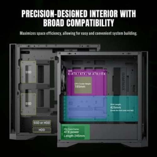 Мультимедійні, Miditower, E-ATX, micro-ATX, ATX, Mini - ITX, Слотів розширення - 7, Вентилятори - 2 х 120 мм, GPU - до 360 мм, CPU - 160, 180 х 400 х 430, 4.8, чорний