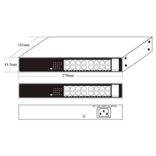 некерований, настільний/в стійку, Портів - 18, 16 x 10/100 Base-T PoE, 2 x 10/100/1000 Base-T uplink, Комутаційна здатність - 14.8 Гбіт/с, МАС - 16000 адрес, Робота - від -20˚ до 55˚ C, Зберігання - від -40˚ до 75˚С, Ш - 270 мм, Г - 181 мм, В - 44.5 мм, 1.7 кг, 16xPoE+ (30W на порт), 16x10/100/1000TX