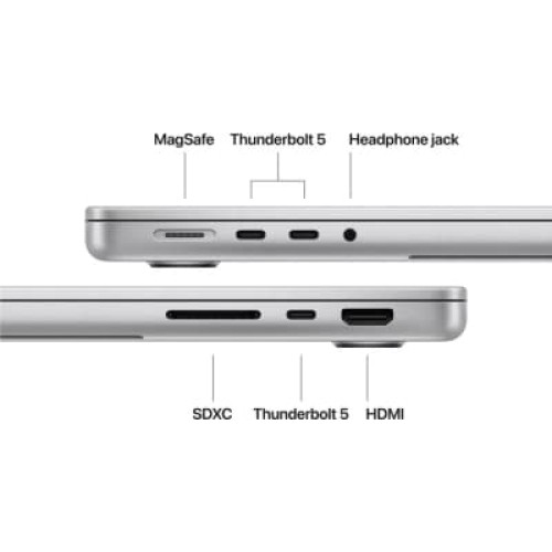 14.2", 3024x1964 (Liquid Retina XDR), Liquid Retina XDR, 1000nits, Apple M5 Pro (4.61 ГГц), 24 ГБ, SSD - 1 ТБ, Apple M5 Pro Graphics (16-core GPU), macOS Tahoe, 72.4 Втг, підсвічування клавіатури, сканер відбитків пальців, українська клавіатура, підтримує під'єднання 2 моніторів, 1.6 кг, сріблястий